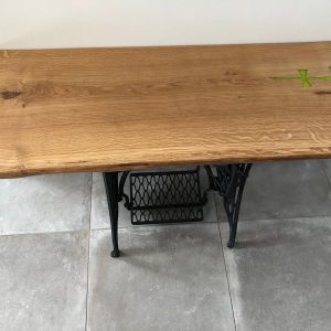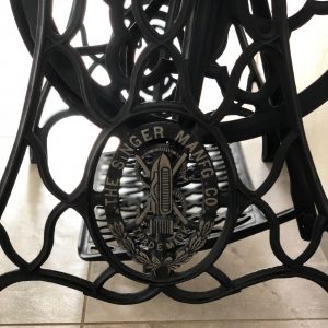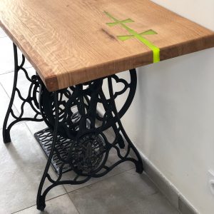 Le pied a été récupéré d’une ancienne machine à coudre Singer à pédale, décapé puis peint en noir mat. Il pourra prendre différentes couleurs selon vos envies.