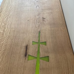 La fente naturelle du plateau de bois a été comblée à la résine epoxy jaune fluorescent en reproduisant un papillon d’ébénisteries traditionnellement pour consolider une fente dans le bois massif.