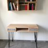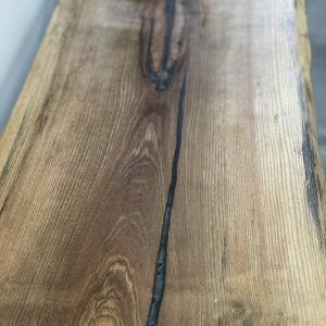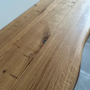 Le plateau en chêne est réalisé sur mesure en fonction de l’emplacement choisi (sur ce modèle 106cm x 50cm). Les nœuds et fentes naturels du bois peuvent être comblés avec de la résine. Sur ce modèle c’est de la résine teintée argent qui a été choisie.
