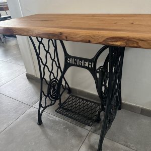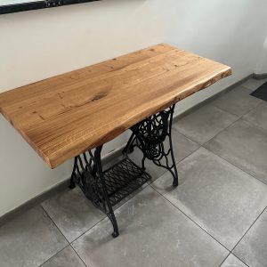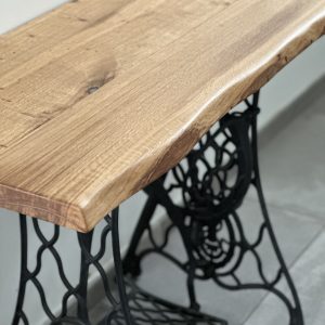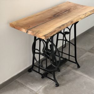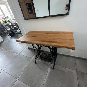 Cette console sur ancien pied de machine à coudre s’adaptera également en meuble tv, table d’appoint ou même en bureau.