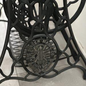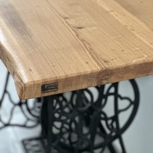 Le pied a été récupéré d’une ancienne machine à coudre Singer à pédale, décapé puis peint en noir. Il pourra prendre différentes couleurs selon vos envies.